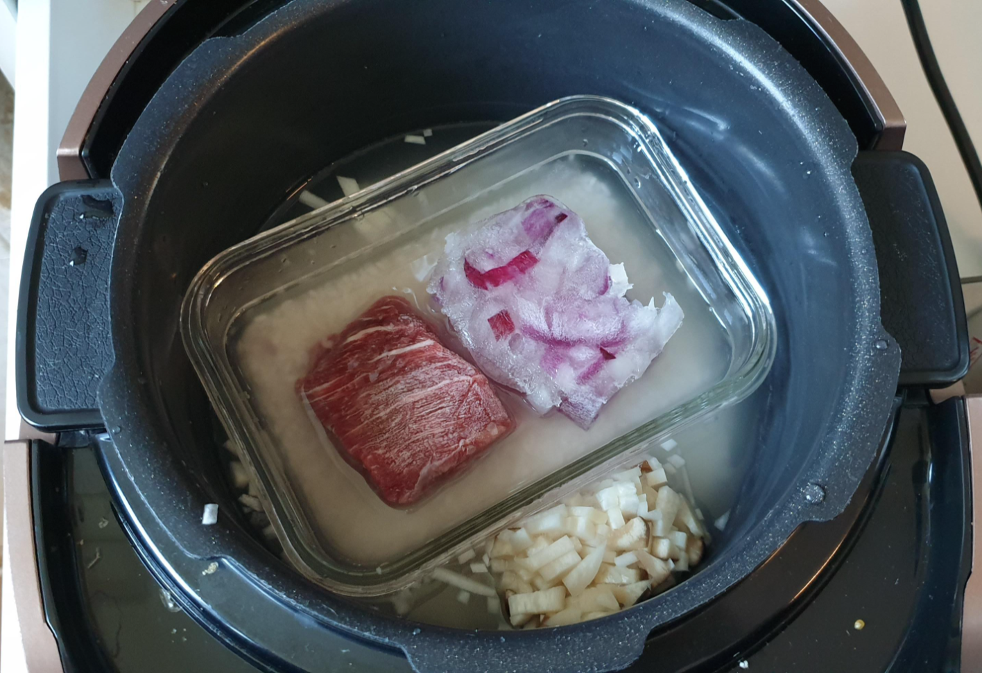 필요한 쌀 : 90g * 쌀을 깨끗이 씻어주세요. 필요재료 : 360ml * 야채육수나 고기육수를 사용해도 됩니다. 고기 또는 닭고기: 90g. 야채 3개 이상: 각 30g. 스팀 탱크 용량: 180ml. 요리 방법.